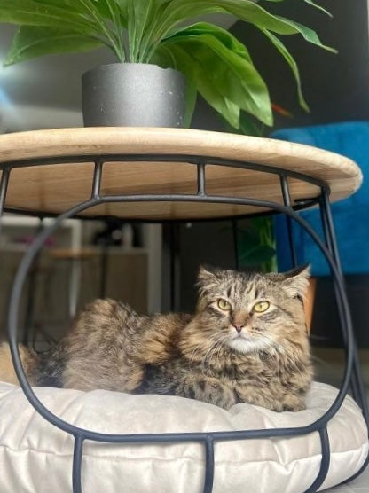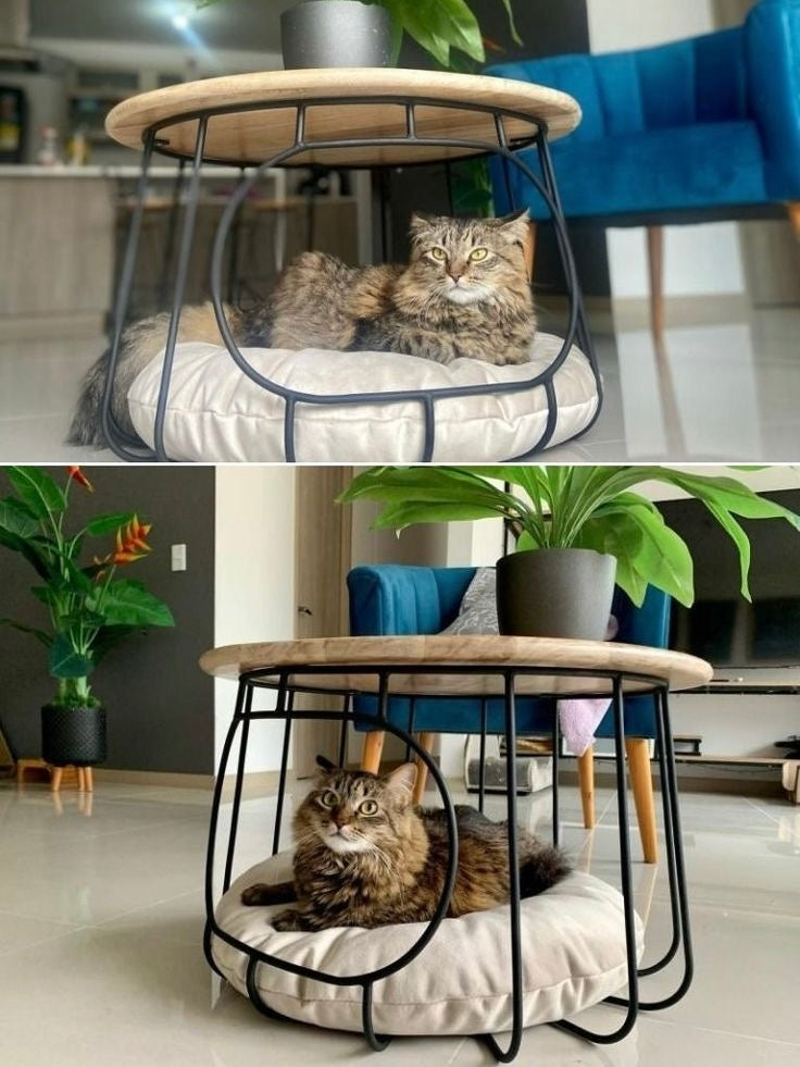 Mesa Nido auxiliar fabricada en HIERRO SÓLIDO y cubierta de madera de pino Su diseño versátil permite usarla también como espacio de descanso para mascotas, combinando funcionalidad y estilo moderno.